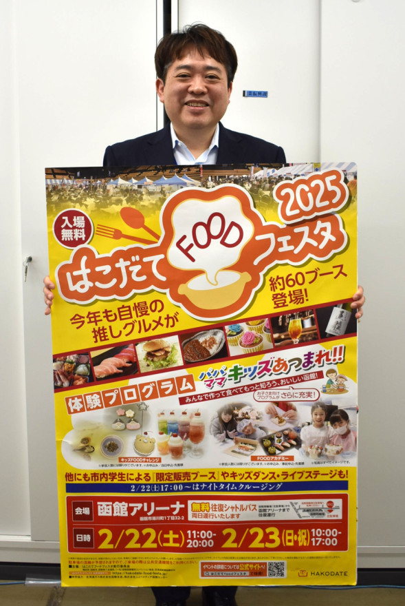 実行委主催。地元の料理やドリンクなど58ブースが出店するほか、市内の学生が企画したスイーツや弁当も数量限定で販売。また、子ども向け体験プログラム「キッズフードチャレンジ」(有料、当日申し込みで先着順)やパフォーマンスステージなど、さまざまなプログラムを用意。入場無料。函館競輪場北駐車場と会場をつなぐ無料往復シャトルバスの運行も。イベントは22日が午前11時~午後8時、23日が午前10時~午後5時。詳細はフードフェスタのホームページで確認を。