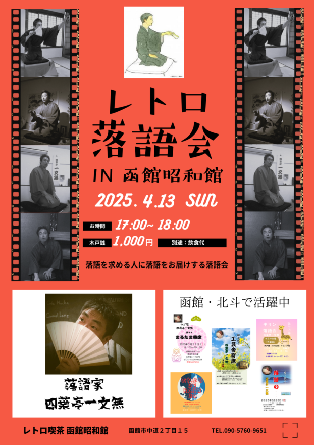 函館市内を中心に活動するアマチュア落語家の四葉亭一文無さんの落語会。木戸銭1000円。別途飲食代。090・5760・9651(同店)