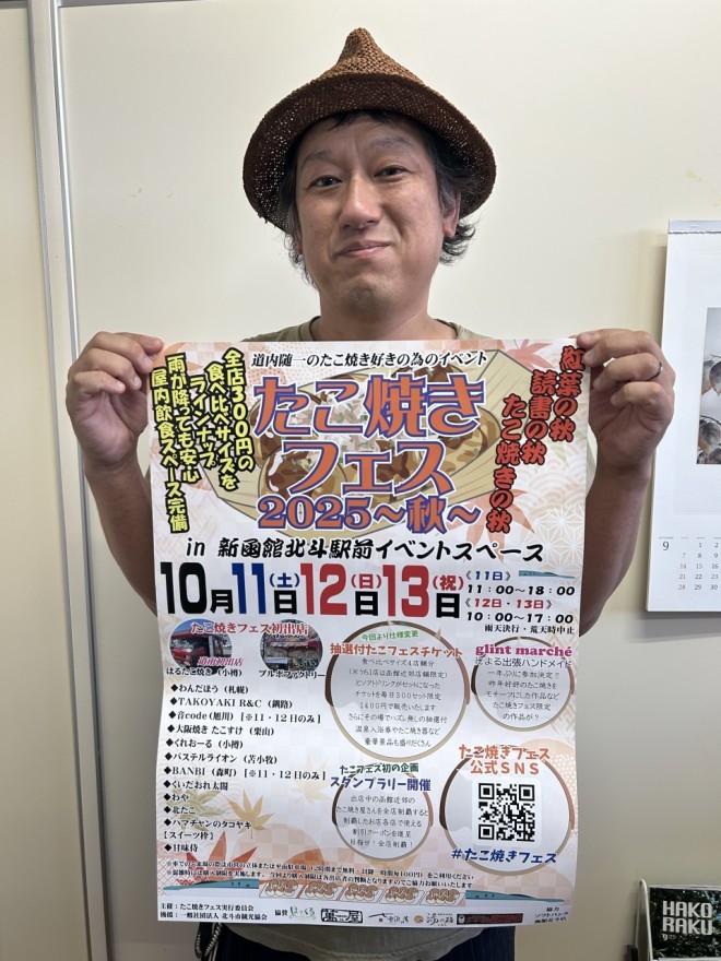 実行委主催。道内各地の人気たこ焼き店が集まる。函館市からは「くいだおれ太閤」「わや」「北たこ」「ハマチャンのタコヤキ」など。札幌、小樽、釧路、旭川、苫小牧や森町などから、計13店舗が出店。通常サイズに加えて「食べ比べサイズ」(税込み300円)を提供。また、4店舗分(うち1店は函館近郊店舗限定)の食べ比べとドリンクがセットになったチケット(同1400円)を、1日300セット限定販売。同チケットはハズレ無しの抽選付で、温泉入浴券やタコ焼き器などが当たる。雨天決行。荒天時中止。11日は午前11時~午後6時。12、13日は午前10時~午後5時。