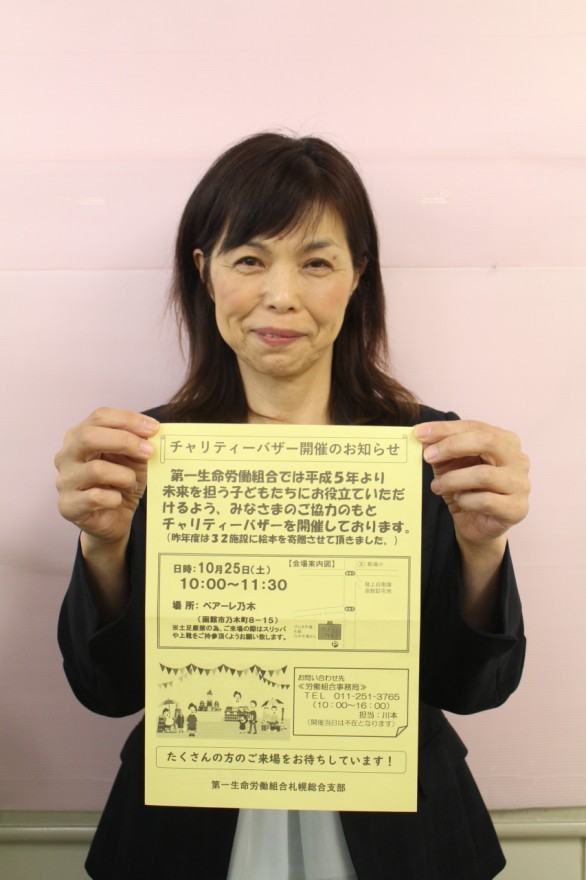 第一生命労働組合札幌総合支部主催。道南の各営業オフィスごとにブースを構え、組合員らが持ち寄った食器や日用品、衣類、おもちゃなどを販売。ほかに市内の水産加工会社や雑貨店なども出店予定。土足厳禁のため、スリッパなどを持参。