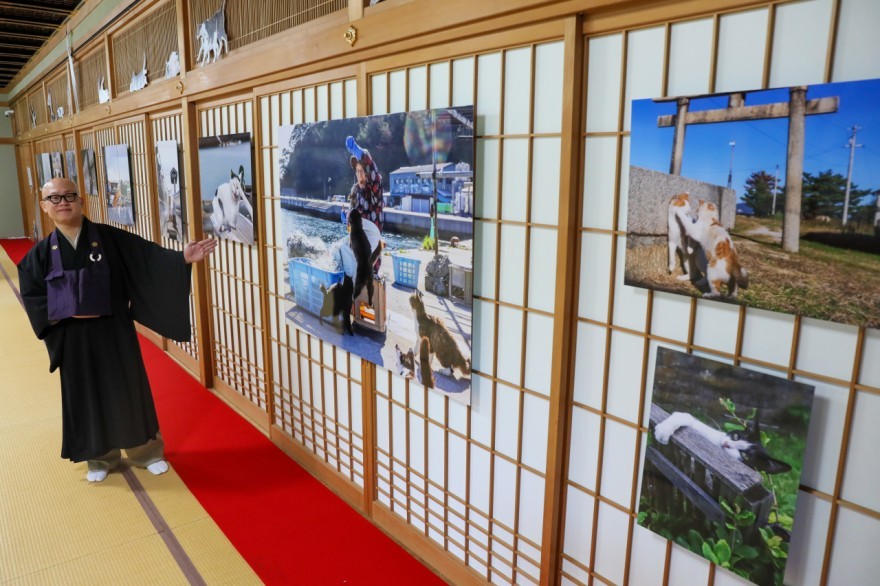 ネコを専門に撮影する写真家、沖昌之さん(東京)の写真展。150センチ×105センチの大判プリントなど44枚はいずれもネコの目線で喜怒哀楽を捉え、各地で暮らすネコの生きざまを伝えている。同寺の僧侶、守永さんの作品も展示している。入場無料。11月1~3日は沖さんが在廊し、午前11時と午後2時の計6回、トークショーも予定。