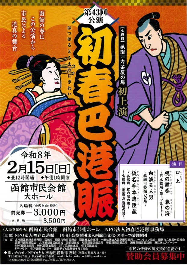 新春恒例の市民歌舞伎。演目は「口上」、「祝の舞奏 春の海」、「白浪五人男」「仮名手本忠臣蔵」。前売り3000円、当日券3500円。問い合わせは0138・27・6618(事務局)