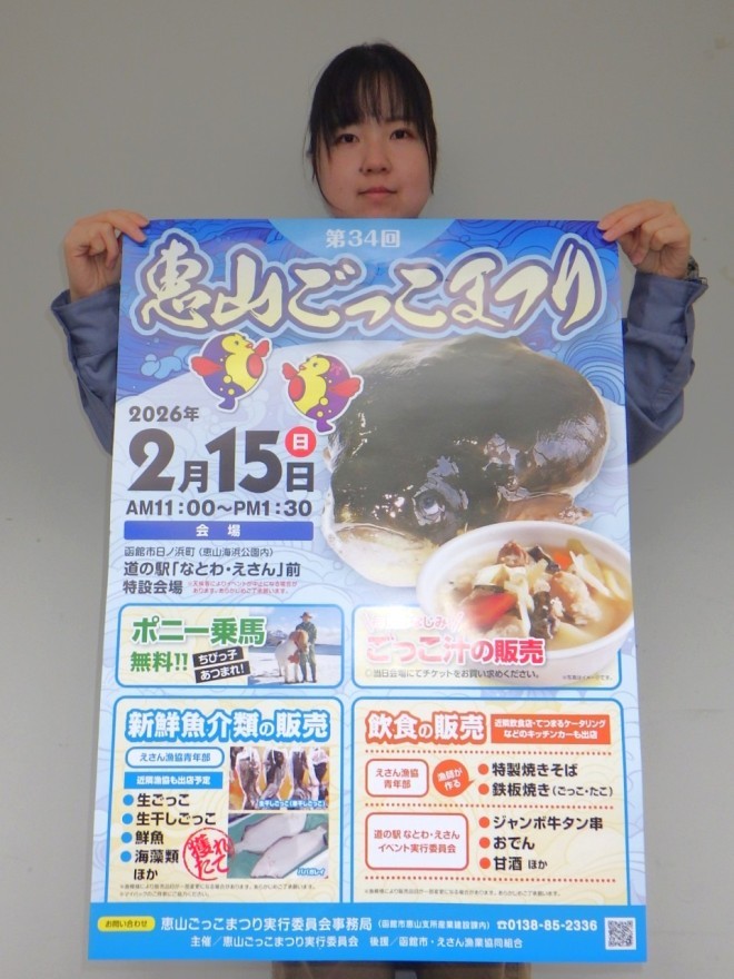 実行委主催。ゴッコ汁を1杯400円で提供(チケットは午前10時半から販売)。生ゴッコや生干しゴッコ、鮮魚のほか、焼きそば、ゴッコとタコの鉄板焼き、ホタテ、ジャンボ牛タン串、おでん、甘酒を販売。キッチンカーの出店や無料のポニー乗馬体験も。0138・85・2336(市恵山支所産業建設課)