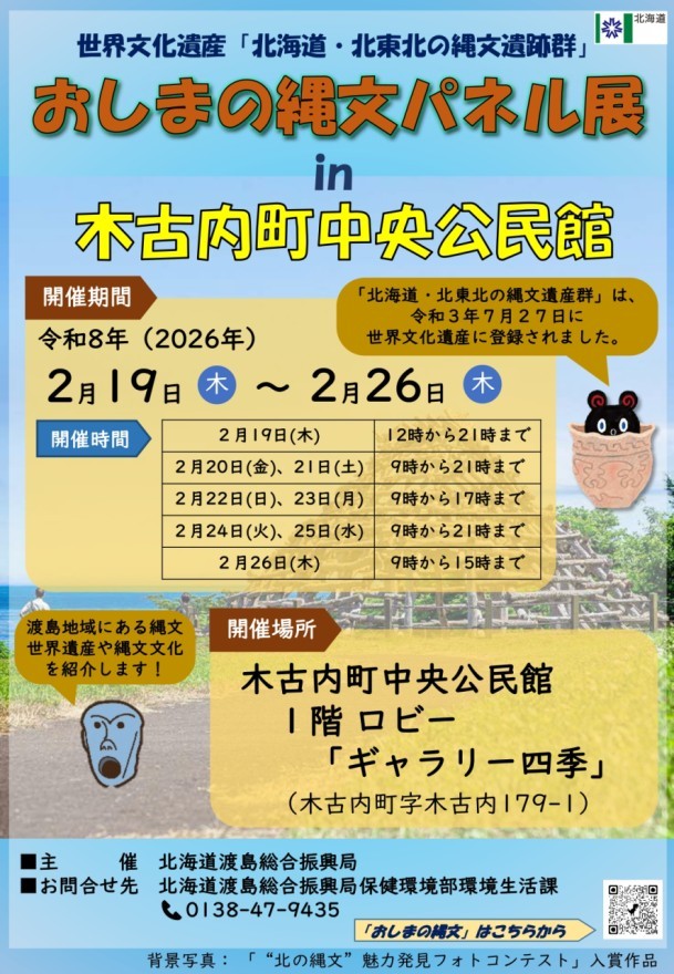 縄文文化や世界遺産の価値を分かりやすく解説するパネル展示のほか、管内の縄文文化施設を紹介するパンフレットを配布。入場無料。0138・47・9435(渡島総合振興局環境生活課)