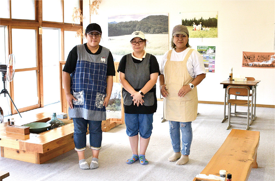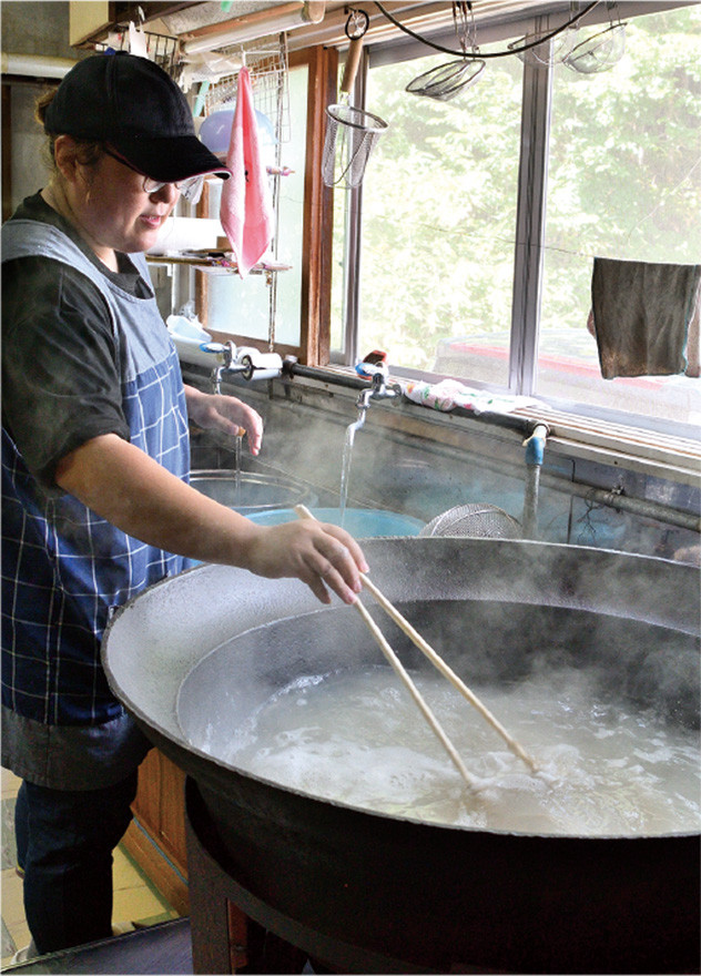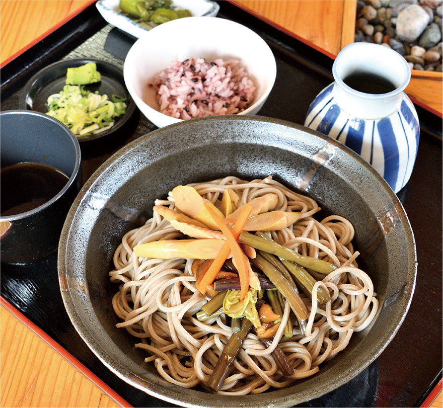 厨房に立つのは中塚かおりさん、岡本智実さん、館政愛澄さん、品川美恵さん4人の〝地元の母さん〟。メニューはもりそばやエビ天そばなどを用意しており、地産地消を掲げ、そばの味を引き立てるつゆのダシにも地場産シイタケやコンブを中心に活用し、甘めに仕上げる。秋の気配を感じるこの時期のおすすめは、山の幸が彩る「冷山菜そば」。つるりとした舌ざわりのワラビ、タケノコ、ナメコと一緒にそばをすすれば、鼻腔をくすぐる力強いそばの風味や香り、滋味豊かな味わいに夏の暑さで疲れた体が癒やされる。