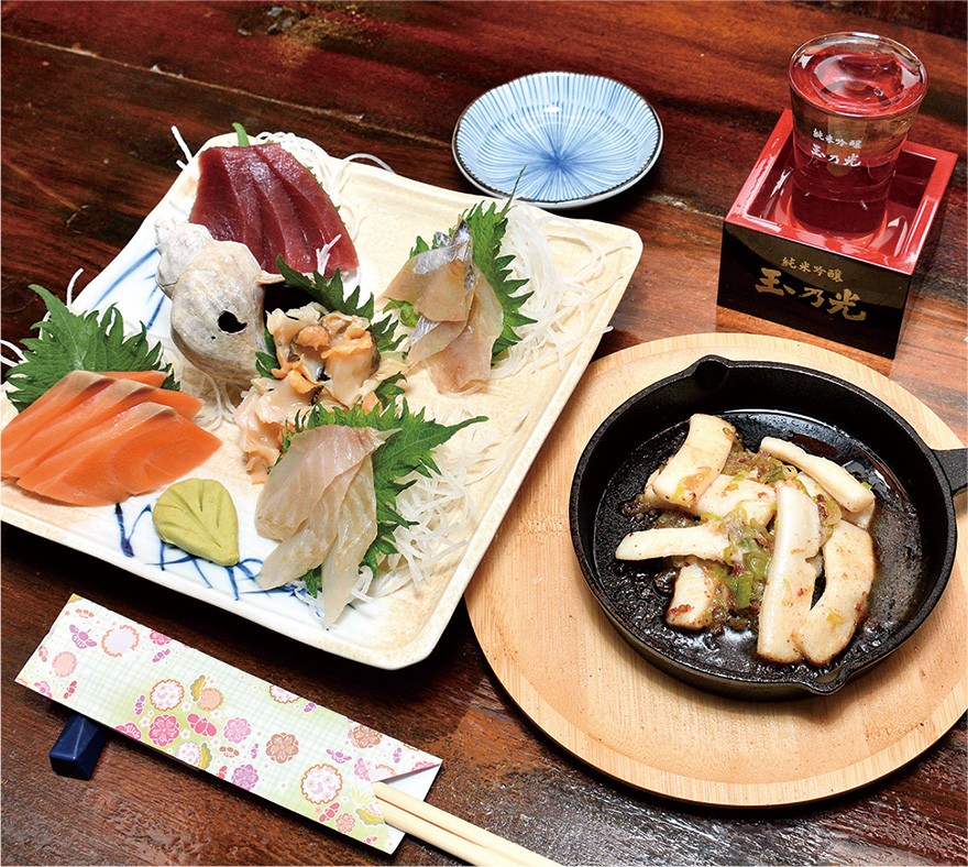昨年8月にオープンした「蝦夷前居酒屋絆ノ和」は、道内や富山で腕を磨いた和田孝明オーナーが故郷に戻り、妻の尚子さんと2人で営む居酒屋。カウンター席からは一枚板のヒノキ製のまな板で、和田オーナーが卸売市場で買い付けた魚介を手際良くさばく様子が間近に見られ、尚子さんの気さくなもてなしも相まって、料理を待つ時間も心が浮き立つ。イカをカツオの発酵調味料で炒める「烏賊の酒盗焼き」は、熱々のスキレットで食欲誘う音と香りを漂わせながら登場し、バターと絡めて味わえば、まろやかなコクと深みある塩味に日本酒が恋しくなる。締めはオーナー自慢の寿司や筋子巻きがおすすめだ。