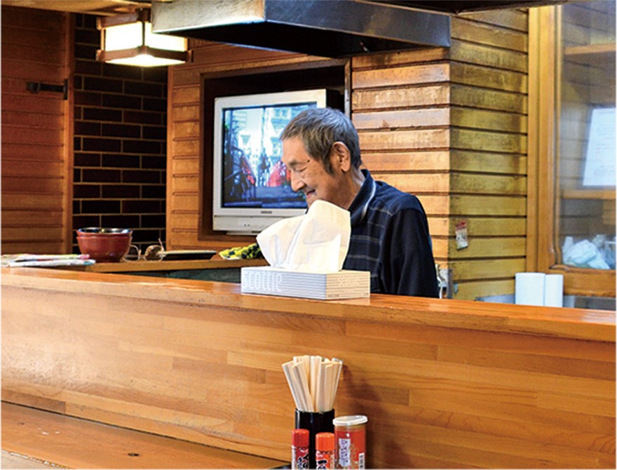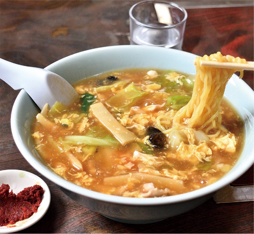 商店が立ち並ぶ森町の中心市街地に、30年前にオープンした「お好み焼みどりや」。山鹿和美店主と妹の濱松節子さんがあたたかくもてなす店は、昼も夜も常連客や観光客でにぎわっている。道南でも珍しい北京料理「ダールーメン」は、開店以来、不動の人気を誇るあんかけしょう油ラーメン。鶏モミジや豚足、香味野菜などでダシを取り、軽くとろみをつけたスープが中太麺によく絡む。熱々をすすれば、豚肉、エビ、イカ、タケノコ、ニラ、キャベツ、溶き卵など具材の旨みも溶け込んだ、優しい味わいに夢中になる。途中で、別添えの特製辛みそを少しずつ加えて、味の変化も楽しみたい。