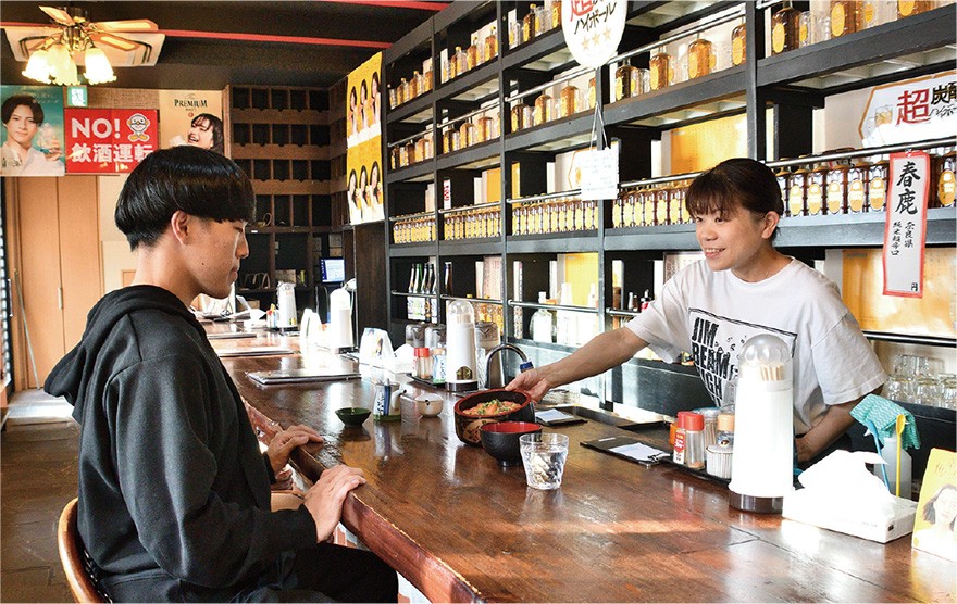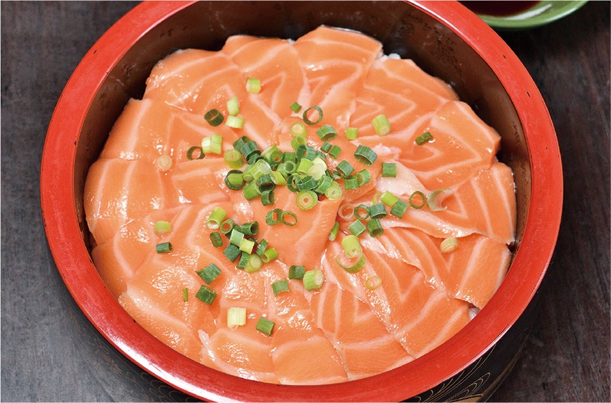 トレーナーの仕事に加え整骨院での施術にも終日取り組み、休日は自らの筋トレも欠かさない伊藤さんは、1度に3合近いご飯を食べることもある大食漢。昨年、勤め先の上司に連れられこの店を訪れると「たくさんの種類からメニューを選べ、おいしいものをお腹いっぱい食べられる」と、プライベートでも利用するようになった。お気に入りは、厚めの豚バラ肉と野菜にニンニクを利かせて炒めた「スタミナ定食」や、炙りチーズのトッピングがおすすめという「ホルモン炒め定食」。どちらもご飯が進むので、店で1番の大盛りご飯に変更するのが伊藤さんの定番に。さっぱりとした部位の切り身がたっぷり乗る「サーモン丼」などの海鮮丼やザンギに甘めのしょう油ダレを絡めた「ザンたれ丼」は、道外の友人や家族を連れて来た時に喜ばれたという。「普段は栄養バランスを考え自炊を心掛けていますが、思い切り食べて元気を付けたい時はここ」と、がっつりご飯をかきこみパワーを補給している。