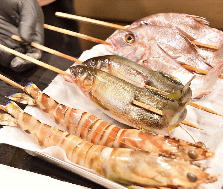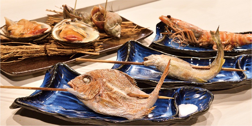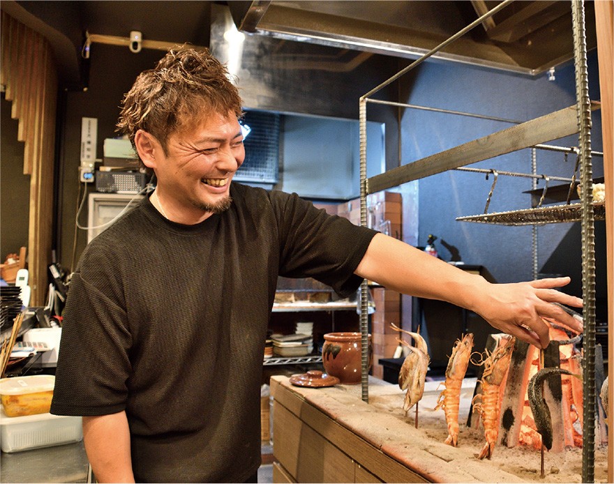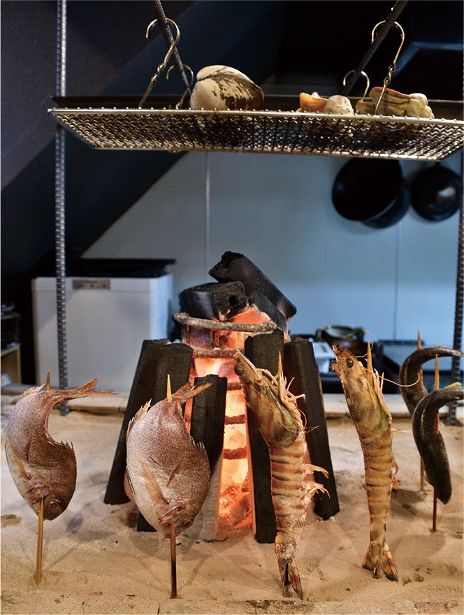 原始焼きの海鮮は、子持ちアユや特大エビを定番に、大槻知世店主が「はこだて自由市場」やなじみの鮮魚店に足を運び、直接目利きした選りすぐり。串を口から通した魚やエビに、炒って雑味を抑え甘みが引き立つ沖縄の塩を振り、腹から火を当てる。「できるだけ待たせずに提供したい」と焼き時間のかかる魚は、あらかじめ火を通し準備しておくという。焼き上がった魚は串を持って、豪快にかぶりつくのが醍醐味。ホクホクとした食感と塩を利かせた身の味わいがクセになる。上部につるした焼き網に置いた北斗産ホッキやツブ貝は直前にバターとしょう油を落として。ふっくらとした貝と旨みが凝縮したダシを堪能すれば、ホッと満足の息がもれる。