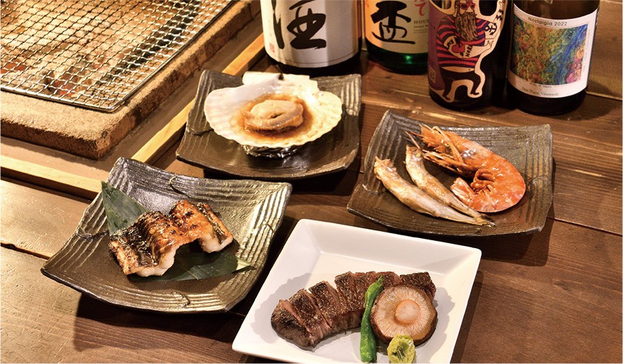 炭火焼きはできるだけ素材そのものの味を楽しんでほしいと、肉に岩塩、魚に海塩を使って、軽く下味を付けたものが中心。魚介は老舗鮮魚店から仕入れる、胆振管内むかわ町産子持ちシシャモなどの定番から日替わりと、林女将が目利きした鮮度の良いものが揃う。この日はあっさりとした味わいのアナゴのしょう油漬け、自家製ネギ味噌がアクセントの身欠きニシン、肉はワサビ塩で口当たりさっぱりと食べられる黒毛和牛イチボ、ラムチョップといった豪華な顔ぶれ。焼き網に乗せじっくり焼き上がりを待てば、立ち上る香りが鼻腔をくすぐり、料理への期待が高まる。