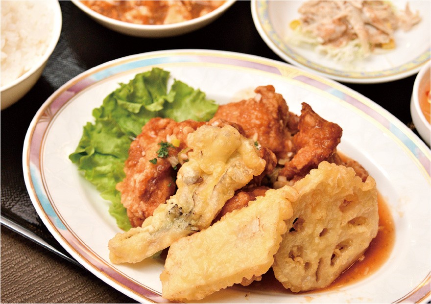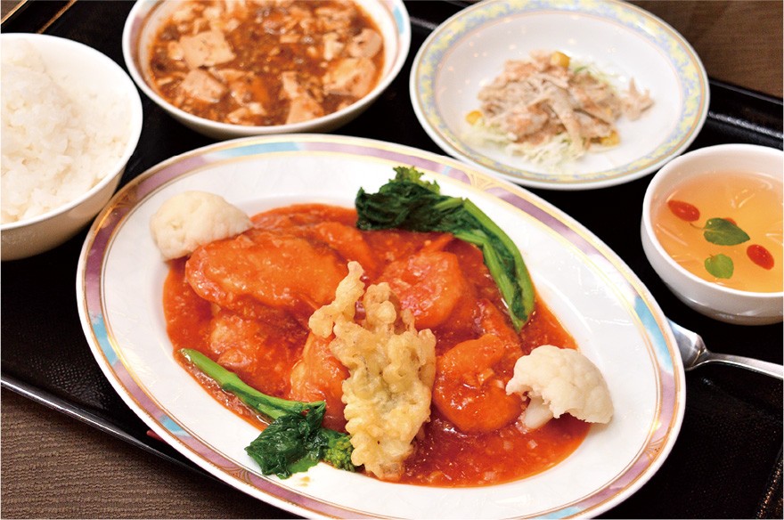 広東、四川、北京、上海など中国料理のジャンルにこだわらず、それぞれの良い所を集めたメニューには、ディナーはフカヒレや北京ダックといった高級食材も並び、敷居が高いイメージを持たれがちだが、ランチはボリュームある月替わりのセットを目当てに、店先に列ができることもしばしば。今月のおすすめ「タラとエビのチリソース」は、トマトペーストから作るエビチリに旬のタラを合わせた一皿で、ネギがたっぷり入るソースの甘みとピリッとした辛さのバランスが絶妙。セットの麻婆豆腐は辛味を抑え、ピーシェン豆板醤や花椒を利かせた独特の旨みを楽しめる。付け合わせやデザートに至るまで、中華の技が光っている。