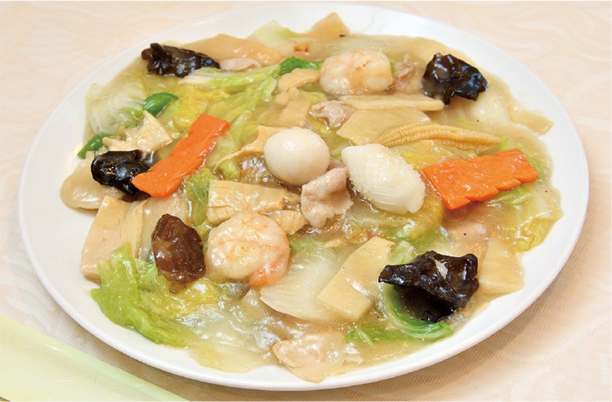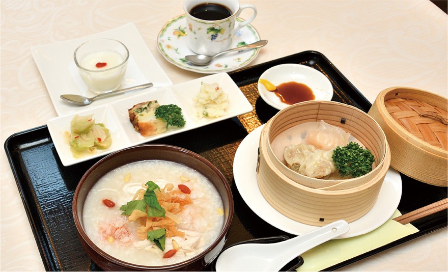 提供するのはあっさりとした味付けで食材の風味を生かす広東料理。ザーサイなどの定番から中国の香辛料・五香粉を利かせたキッシュまで、ピンチョス3品が日替わりで付くランチセットは、じっくり焼き目を付けた香ばしい麺に、具だくさんで濃厚な塩あんがたっぷりの「あんかけ焼きそば」が1番人気。移転以来注目されている「中華粥」は、エビ、カニ、蒸し鶏をあしらった見た目にも美しい一品で、ふんだんに野菜を加えた鶏ガラベースの清湯スープが味の決め手。一さじごとに米の甘みとスープの優しい旨みが口の中に広がり、パリパリの揚げワンタンを浸しながら味わえば体の奥から温まり、至福の満足感に包まれる。