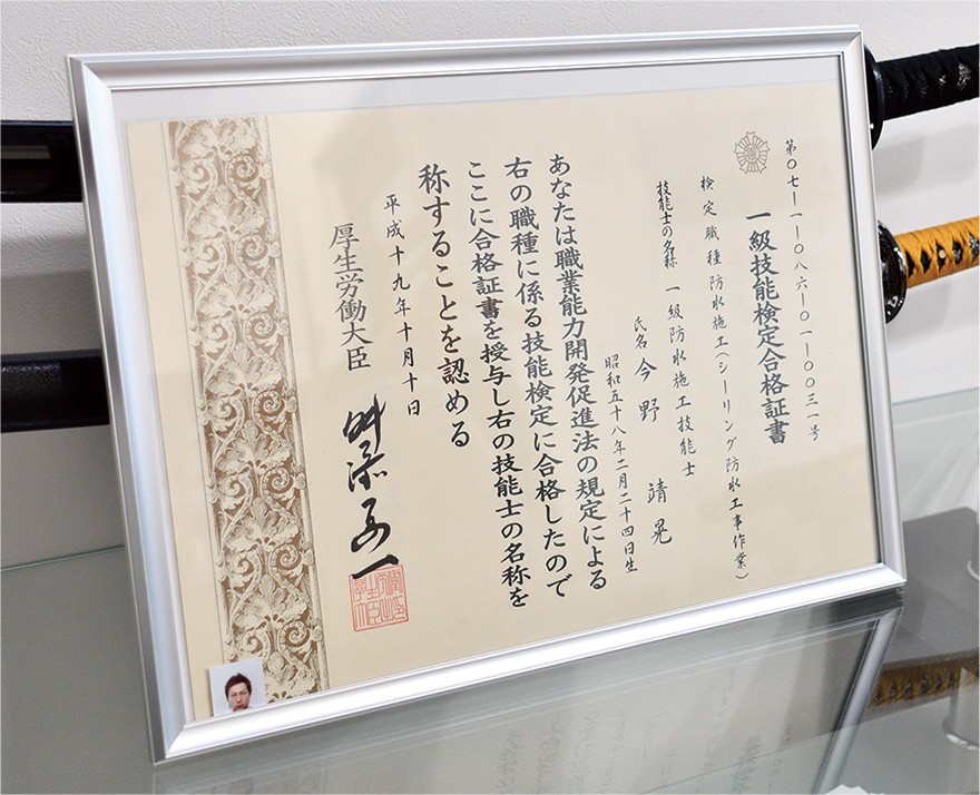 防水工事は施工場所やシーリング材の種類によりさまざまな施工方法があり、今野社長が持つ国家資格の一つ「一級防水施工技能士」は最短で取得に7年かかる。工事に建築知識が必要な場面も多く、普段から建物を見て勉強するという。「業界の高齢化が進んでいるので、職人も育てていかないと。重いものを持つ作業が少ないので女性も活躍しやすい職種だと思います」と、従業員の育成にも力を入れる。「家はお客様にとって一生に一度かもしれない買い物。丁寧に安全にをモットーに、一軒一軒を自分の家と思って施工したい」と、常に感謝を胸に現場に向かっている。
