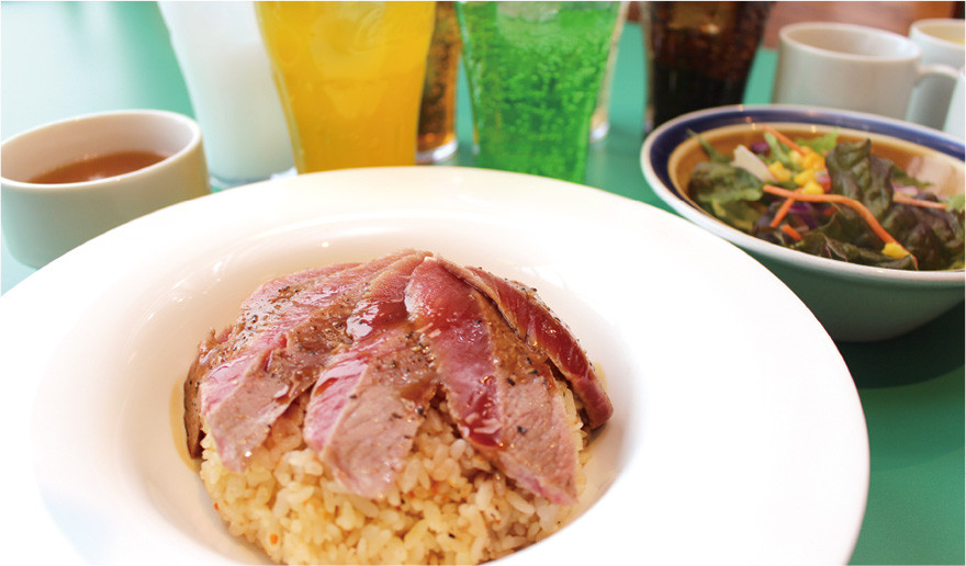 ビーフステーキピラフは、独自のスパイスを使って炊き上げたピラフの上に、牛ロース肉のレアカットステーキをぜいたくに乗せた、創業以来人気の看板メニュー。しょう油ベースのオリジナルソースは、トラピストバターがアクセントになり濃厚でコクがある。セットのドリンクバーやスープバーもうれしい。