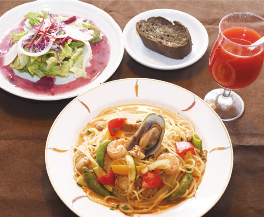 日替わりのスパゲッティに、自家製バゲット、サラダ、ソフトドリンクが付くお得なセット。ほかにもクリーム系やグラタン仕立てなど季節感あふれる単品スパゲッティを豊富に用意し、素材を生かした味わいが人気を集めている。ログハウス造りのぬくもりある空間で、ゆったりと秋のひとときを楽しみませんか。