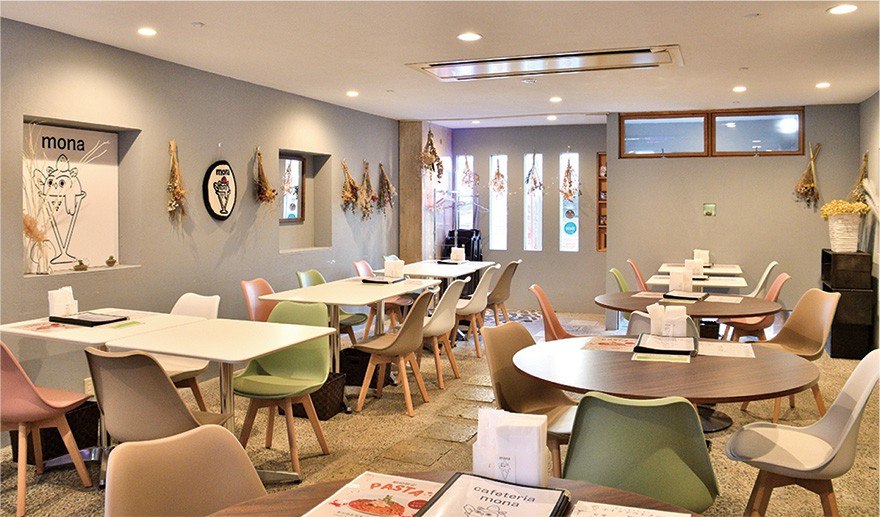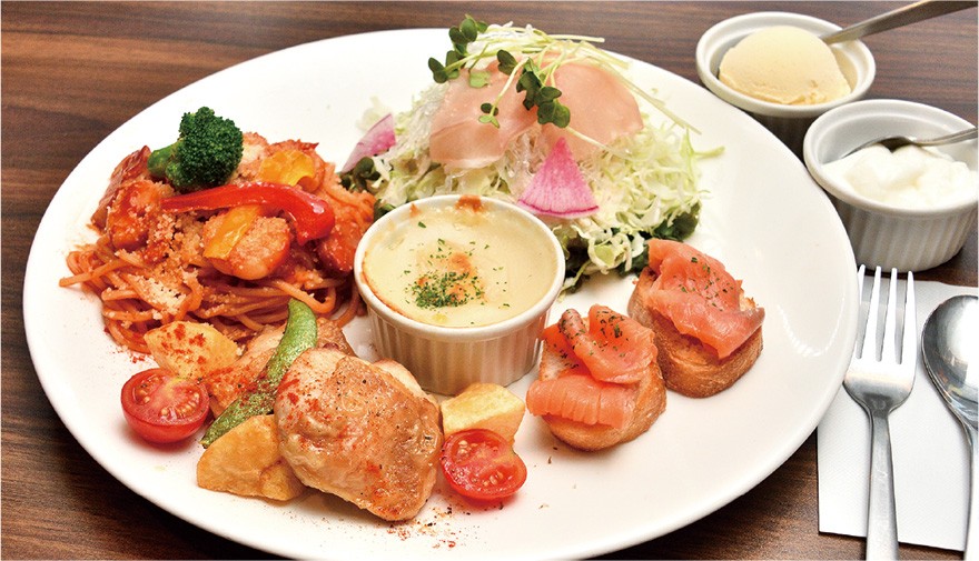 生ハムサラダ、ナポリタン、チキンソテー、グラタン、スモークサーモンのバケットにデザートが付く人気No.1メニュー。いろいろな料理を楽しめて、野菜がたっぷりなのもうれしい。ほか、蟹のトマトクリームパスタや駒ケ岳ポークのピザ、ふわとろオムライスなど、道産食材を生かした多彩なメニューを揃える。