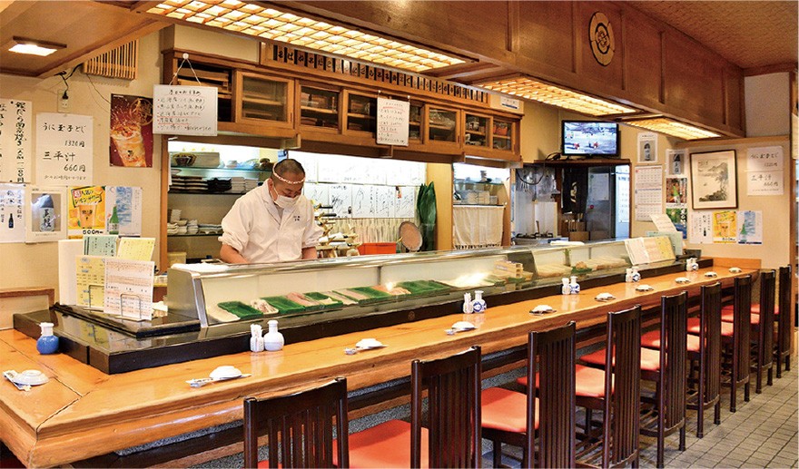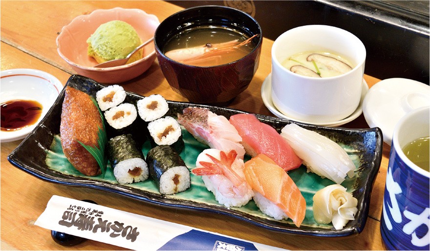 その日の仕入れで決まる握り寿司5貫と巻き物1本、いなり寿司1個に、茶碗蒸し、エビ頭みそ汁、アイスクリームが付く、地元客に人気のランチメニュー。旬の近海ネタを生かし、受け継いだ技で手際よく握る老舗の味を手頃な値段で味わえる。ほか、特上寿司にカニみそ焼き付きのCランチ(3,000円)も。