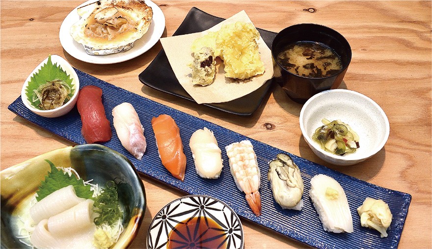サクサクの天ぷらや香ばしい帆立バター焼き、イカの刺身のおかず3品に、3種類から選べるメインのご飯ものがセットになった豪華なメニュー。ご飯ものはネタが日替わりの「寿司」と「海鮮丼」、具だくさんの「帆立みそ焼釜めし」を用意している。ランチ限定価格。ほか、釣りたてが食べられる「いか釣り体験」(休止の場合あり)も実施中。