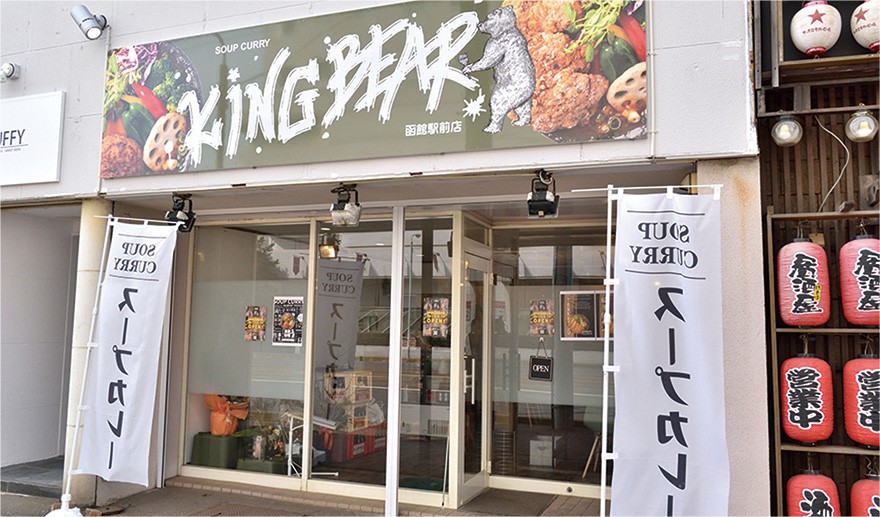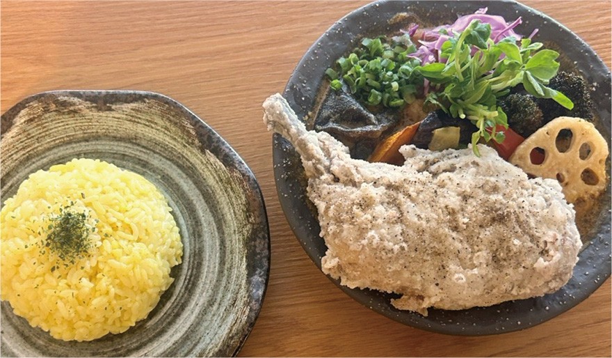 チキンブイヨン、ベジブロス、コンブと煮干しのダシを合わせ、コク深いスープカレーを提供する専門店の一押しメニュー。高温で揚げたボリュームあるチキンレッグは、外はザクッとパリパリ、中はホロホロ。函館限定の自家製スパイスでチキンに味を付けてあるので、そのままかじりついてもスープに浸しても楽しめる。