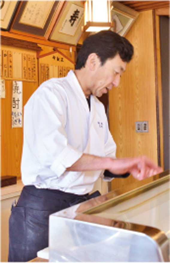 銀座通りから続く路地に店を構え82年目の「祐鮨」。縄のれんをくぐると石が埋め込まれた土間風の床が広がり、一枚板の風情あるカウンター席が目を引く。三代目として寿司を握るのは吉野祐一さん。先代から受け継ぐシャリは、井戸水にコンブを入れて炊いた米を赤酢で仕上げており、ほんのりと茶色がかった艶がある。かんぴょうなどは変わらぬ自家製で、中でもたまご焼きはイトヨリダイのすり身を入れて焼き上げており、仕上がりに2時間もの手間をかける。「おいしくないと思われたら次はない。その1回を満足させること」を大切に握ってきた。カップルには2人一緒に楽しめるよう女性のシャリを小さくするなど気配りを欠かさず、地元客はもちろん、観光客の中にも根強いファンを持つ。「高級店ではないので一回来てくれれば安心してもらえると思いますよ」と気さくに話してくれた吉野さん。毎年函館バル街に参加するなど、こだわりの寿司を気軽に楽しませてくれている。