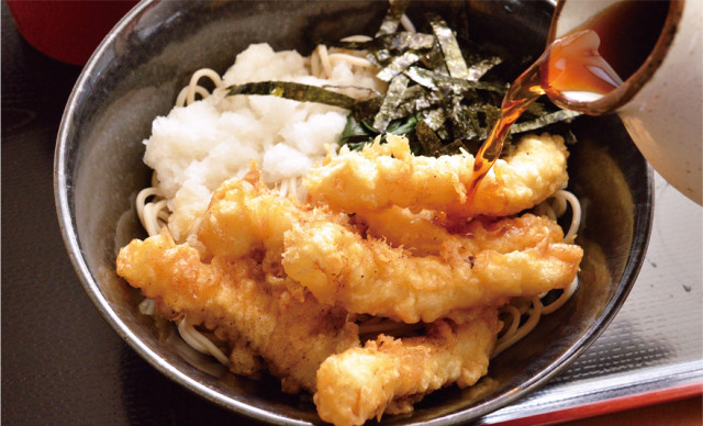 「蕎麦処 かしわ屋」がこの地に暖簾を掲げたのは98年前。前身となった同名の店の歴史は明治にまでさかのぼり、現在は創業者の大おいに当たる小川修司さんが三代目を務める。店の味を守るのに欠かせないのが、生地が香り立つよう白木鉢で湯練りする毎朝の製麺で、滑らかに仕上げる細麺はつるりと心地良い喉越し。カツオダシに秘伝の隠し味を加えたつゆをたっぷりと掛けて味わう「イカ天おろし」(700円)は、ふわりと衣に包まれたやわらかなイカ天の軽い口当たりに食欲を誘われ、もりもり食べれば夏の暑さも乗り越えられそう。16年前に店が火事に遭った時には閉店も考えたが「沢山の方に〝やめないで〟と言ってもらい、こんなにも思われていたんだと涙が出た」と小川さん。「味に愛情が込もっている」と毎日のように通う人や、妻の真智子さんとの会話を楽しみに訪れる人。味はもちろん、店主一家にまた会いに行きたくなる、そんな雰囲気が長年愛され続ける店を物語っていた。