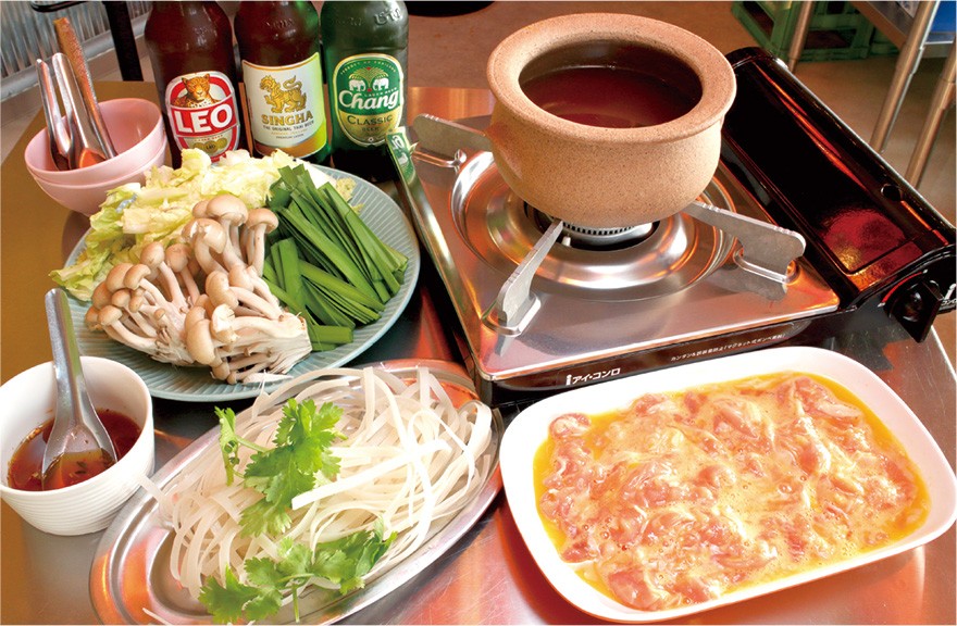 南国ムードが漂う店内で味わえるタイ料理が好評の同店では、出汁のスープに卵を絡めた豚肉やニラなどの野菜を入れ、特製つけダレをつけていただく冬期限定「チムチュム鍋」(1,300円・2人前から)を提供中。米粉麺のクィッティオもセットされており途中で入れたり、締めに食べたり自由に楽しめる、寒いこの時期に食べてほしい鍋料理。今後、トムヤムラーメンなど新メニューも登場予定。