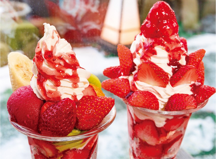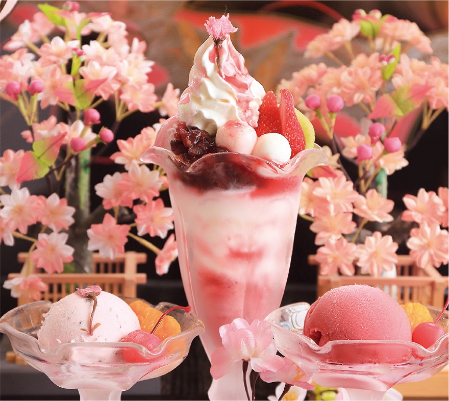 豊富なパフェメニューが魅力の「パーラー花車」。春のイチオシは、懐かしさと新しさを兼ね備えた和スイーツの「桜姫」。木イチゴのジェラートに山川牛乳ソフトと桜ソースを重ねた春らしいパフェ。ほか、旬のイチゴを1パック以上使った「イチゴデラックス」(1,600円)や沢山の果物をトッピングした「小春」(1,200円)も人気。