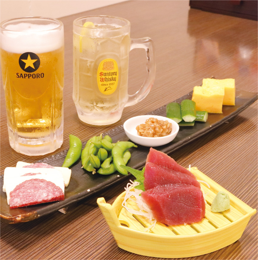近海産の新鮮魚介が人気の同店から、大将のイチオシ「晩酌セット」の紹介。卵焼き・もろ味噌キュウリ・枝豆・サラミ・チーズに、小舟に乗った食べ応えのあるマグロの刺身が付くお得なセット。ドリンクは、生ビール・ハイボール・焼酎・日本酒の中から1杯選べる。ほかリーズナブルな刺盛り「函館」(2人前・1,500円)や、4~5人でも楽しめるボリューム満点の「遊楽部」(3,500円)もおすすめ。