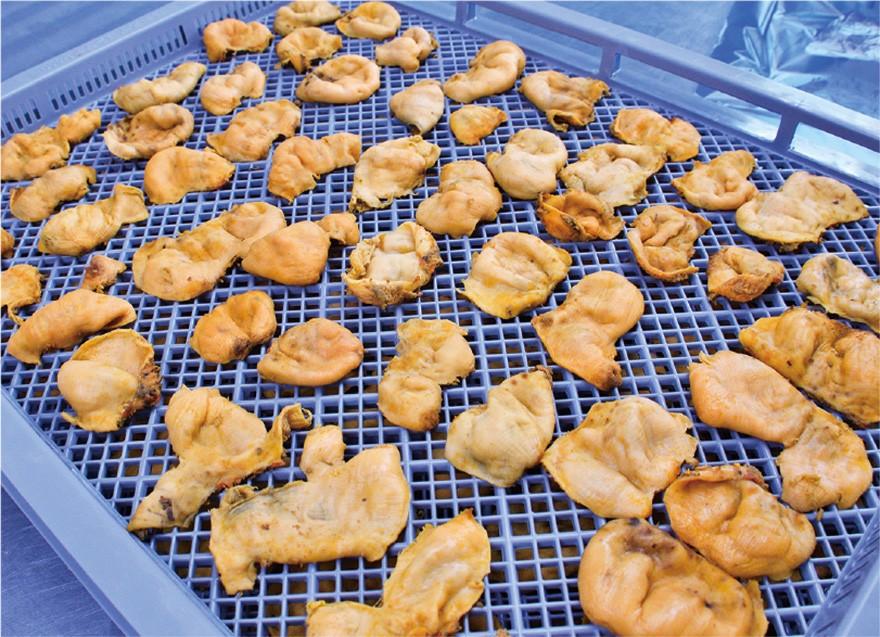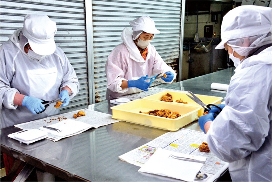 鹿部の「株式会社イリエ船橋商店」は、噴火湾の豊かな漁場で水揚げされる新鮮な魚介を原材料にした水産加工品の製造、販売会社。1952年に創業者の船橋第次郎さんが個人事業として卸売を専門に、折箱に詰めた生鮮ウニを東京築地市場へ空路で出荷したのが始まり。代を重ねる中で3代目の吉右衛門さんが、ウニ漁が休みになる冬季に新たな仕事を生み出したいと、前浜で豊漁が続いたスケトウダラの魚卵を原料に、添加物を減らし、天然調味料にこだわったタラコの製造を75年に開始した。92年に「有限会社イリエ船橋水産」を設立し、辛子明太子の製造にも着手。時代が進むにつれ、安価な海外産魚卵が市場に入るようになると、国産魚卵が値崩れし苦境に立たされた。打開策として、2010年に販売部門を立ち上げ小売業に着手。商号を変更して現社名となった。現在は娘の井上千春さんが4代目を継ぎ、営業部長兼工場長で3代目の妻・敦子さん、販売部長の鈴木昌志さんが脇を固め事業をけん引。地産地消にこだわり、食べる人の健康を考え、添加物を極力抑えた製品作りは全国でも高評価を受け、中でも「海峡はちみつ明太子」は全国観光土産品連盟推奨品に、道立工業技術センターや町製品開発研究会と共同開発した干物「軽石干し」は、北のハイグレード食品や国土交通省全国地域づくり推進協議会会長賞などを受賞し、品質の良さは折り紙付きだ。