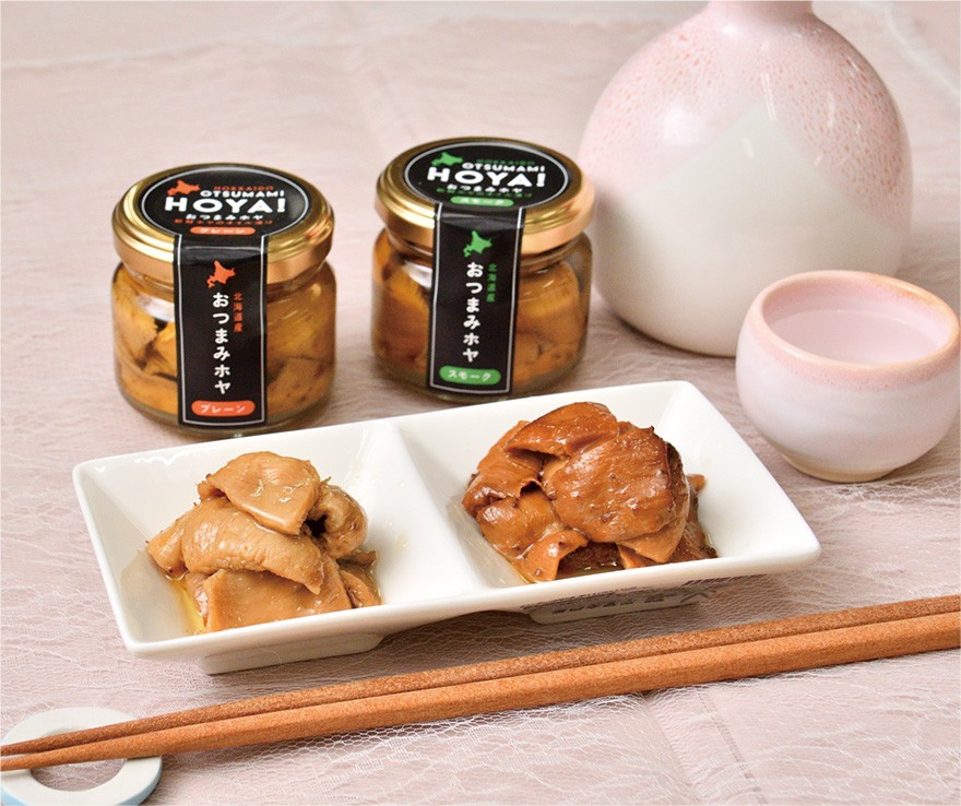 栄養価の高いホヤを使った「おつまみホヤ」は、昨年完成したばかりの一品。コンフィ仕立てで食感がよく、今年、北のハイグレード食品に選定された。商品化へのきっかけは、2023年、東京電力福島第一原発からのALPS処理水の海洋放出を受け、多くの国で日本産水産物の輸入規制が実施されたこと。鹿部で唯一ホヤを養殖し、主に韓国や中国に輸出していた漁師の故・新田邦雄さんもその影響を受け、行き場を失った大量のホヤの活用法を鈴木部長に相談。北斗にあるレストラン「Pokke dish」オーナーシェフ・齊藤亘胤さんから「洋風のおつまみにしては」というアドバイスを受け、開発をスタートさせた。開けたらすぐに食べられる常温保存に主眼を置いて研究を重ね、道立工業技術センターにも協力を仰ぎ商品化。製造はすべて手作業で、旬に仕入れて原料加工し冷凍保存していたホヤのむき身と、旨み成分たっぷりのホヤ水を一緒に煮込み独自の風味を残す。水分を飛ばした身を食べやすいサイズにカットし、ピンセットで丁寧にびんに詰めて、コメ油で満たす。スチームコンベクションを用いた脱気と殺菌作業を経て、無菌条件をクリア。調味料は素材の味を生かす塩のみ。プレーンとサクラチップで燻製をかけたスモークの2種類を用意し、アンケート調査でも評判は上々だ。直売所ほか道の駅「しかべ間歇泉公園」で購入できる。「昨年1月に亡くなった新田さんの思いがこもった商品。鹿部のホヤのおいしさを広く知ってほしい」と敦子さん。今後も前浜の魚介を無駄なく活用できる商品を生み出したいと意欲を燃やしている。