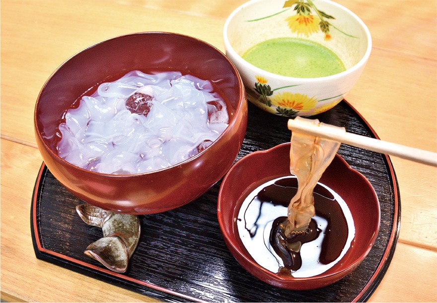 「茶房かげさわ」は、街の人がくつろげる場をつくりたいと、2003年に景澤呉服店内に併設してスタートし、現在は景澤富佐子さんが先代から引き継いでいる。茶釜で沸かした湯で淹れるコーヒーや紅茶、自家製梅シロップの「梅ジュース」、スイーツなどを用意し、穏やかな時間を提供。「くずきり・抹茶セット」(1200円)は、厳選した葛切りと黒蜜を京都から取り寄せ使用。葛切りのもっちりとして滑らかな食感を生み出すため、手間を惜しまず、水に3時間さらし、注文を受けてからゆでて蒸らし氷水で締めるという。葛切りを食べ終わったタイミングで点てて出される抹茶を一口含めば、舌に残る黒蜜の甘さと抹茶のほろ苦さが口の中で引き立て合い、清々しい余韻が広がっていく。
